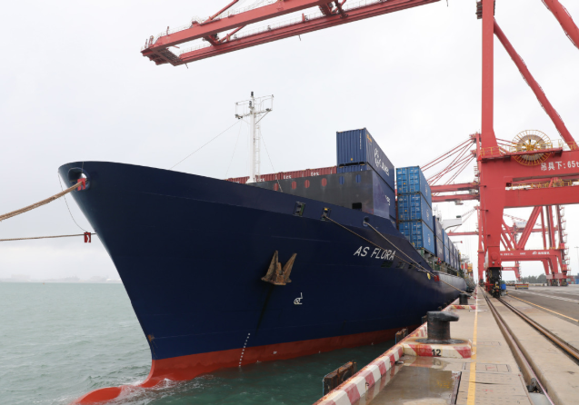A container vessel leaves Yangpu Port, Hainan province, for Vietnam. [Photo by WU MAOHUI/XINHUA]
