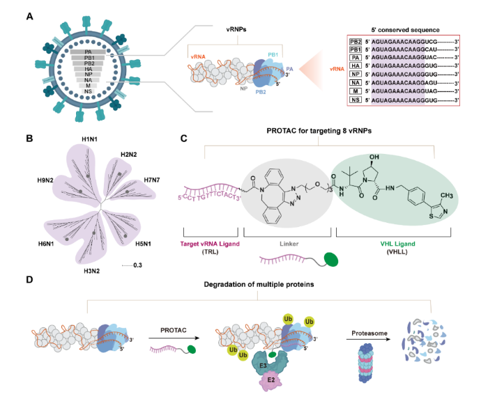 南开大学化学学院研究员刘书琳团队近日成功开辟出一条广谱抗甲流新路径,该策略通过同步降解病毒复制核心的多个关键组件,从根本上瓦解病毒的进化优势,为开发下一代强效、持久且广谱的抗流感药物奠定了坚实基础。相关研究成果近期在国际学术期刊《美国化学会志》上发表。